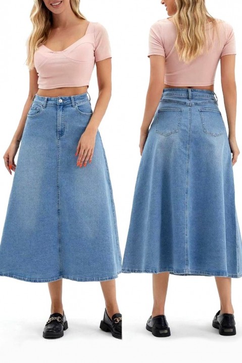 - За дамите, които не изневеряват на стила си – миди пола, изработена от висококачествен деним, подходяща за различни поводи.