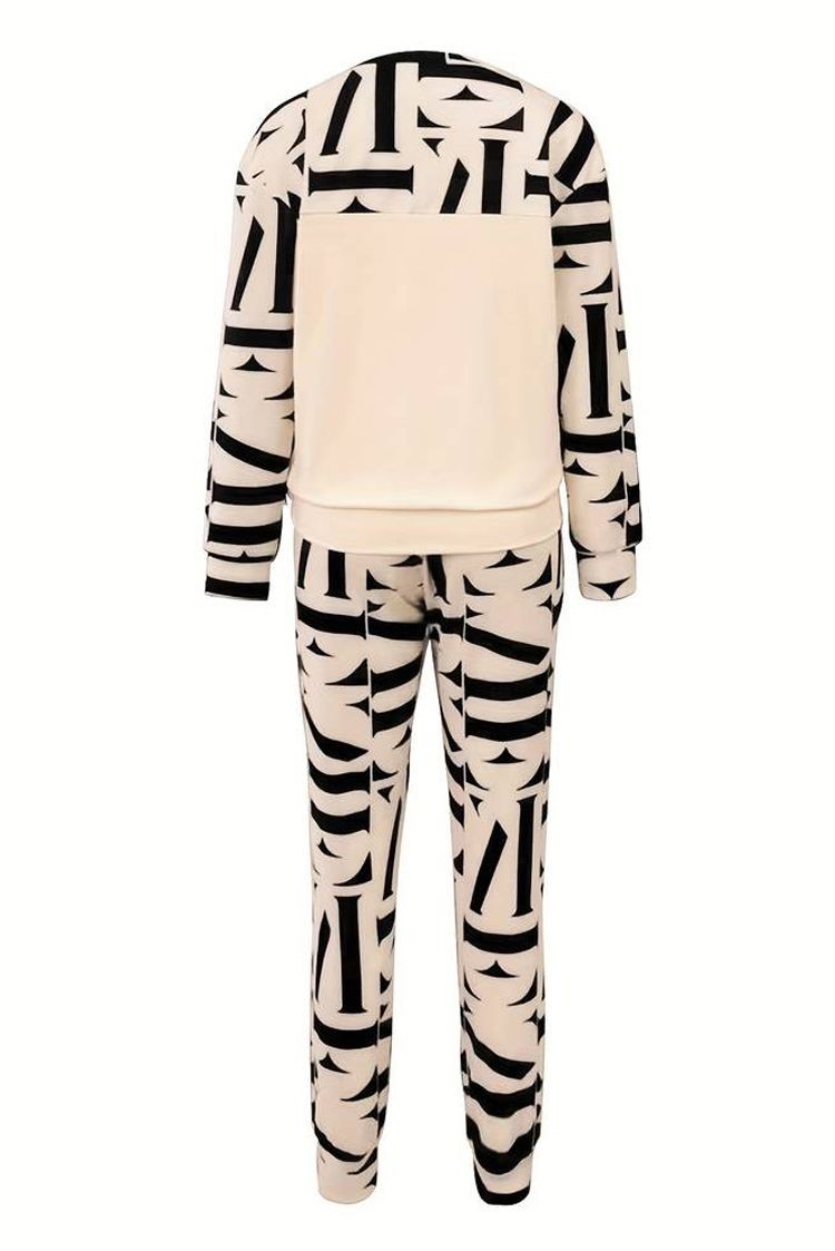• Блузата е с дълги ръкави с ластик в края и триъгълно деколте, а панталонът е с висока талия и комфортна кройка.