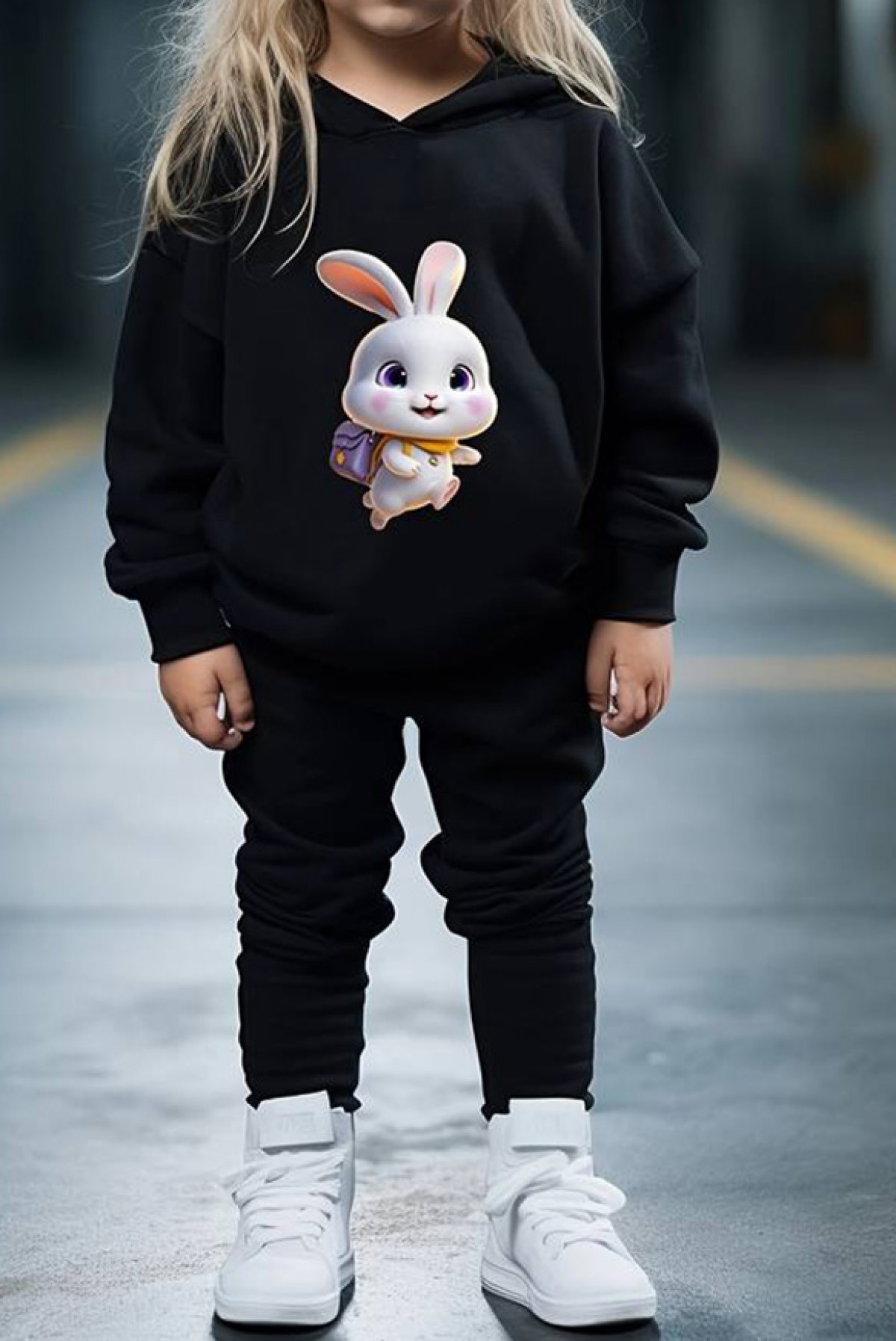 • Горнището е с качулка и атрактивна щампа на зайче, а панталонът е с ластична талия и удобни крачоли.