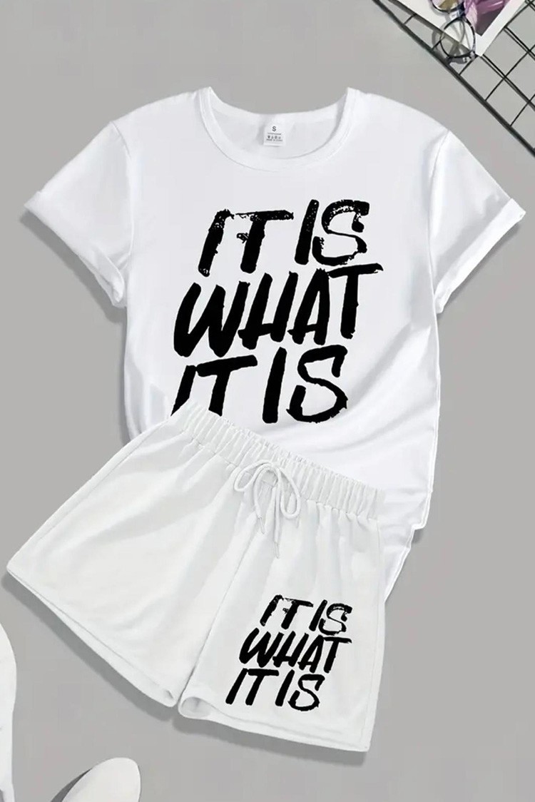 - Горната част е с къси ръкави, ефектен надпис и свободна кройка, а панталонките са с висока, ластична талия с връзки.