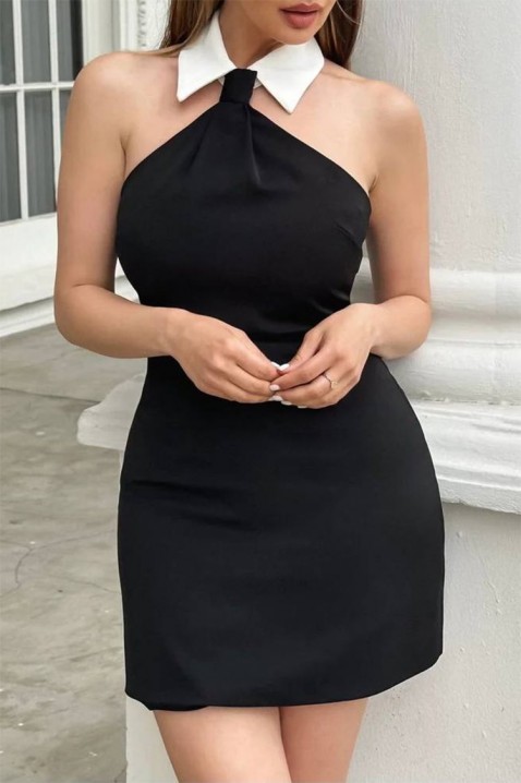 - Моделът е без ръкави, с класическа яка в контрастен цвят и актуална дължина над коляното.
