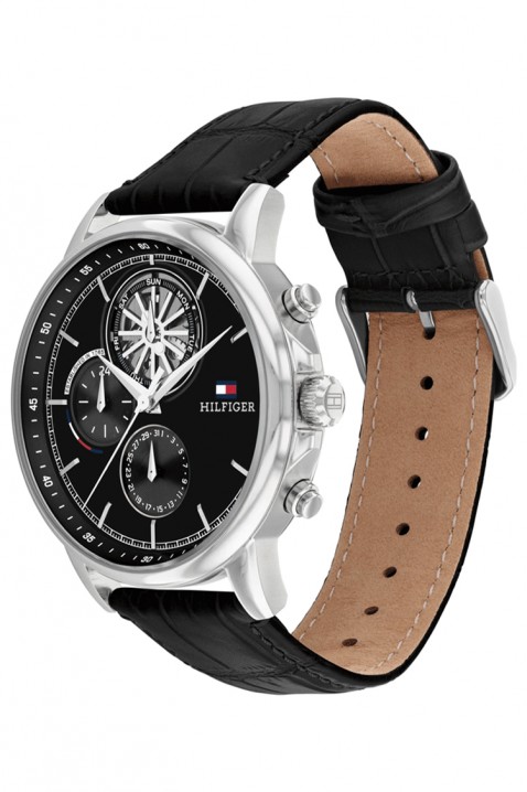- С корпус от неръждаема стомана, черна кожена каишка и стилен циферблат с хронограф, този часовник е перфектният аксесоар за модерния мъж.