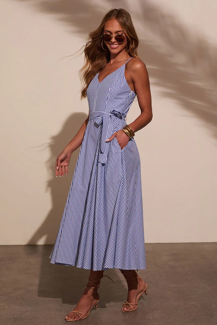 - Изберете тази миди рокля с атрактивен десен на райе, подходяща за различни поводи.
