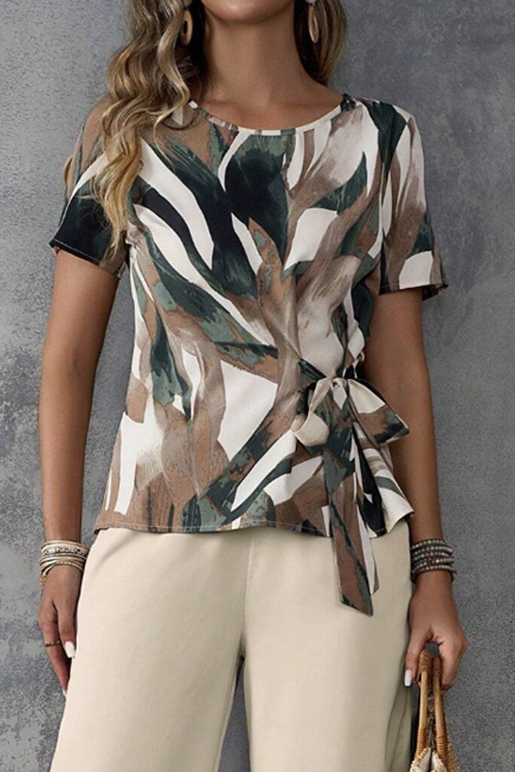 - Панталонът е с висока талия и широки крачоли, а блузата е с къси ръкави и свободна кройка.