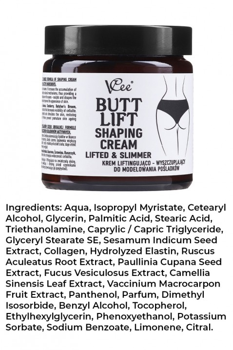 Кремът  за моделиране на седалището на полската марка VCee е богат натурален продукт, който с лекота стяга, докато деликатно повдига и придава обем. Формулата на козметиката е с уникална комбинация от активни съставки, които моделират и изглаждат задните части, придавайки им по-красива форма. Маслото от сусам поддържа кожата мека и еластична, осигурявайки забележителен стягащ ефект. Освен това насърчава естествените процеси в организма и помага за постигането на по-повдигната форма. Колагенът също повишава еластичността, докато екстрактите от чай, гуарана, червена боровинка и водорасли подхранват и изглаждат.