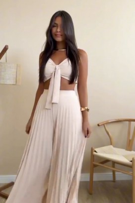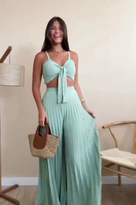 - Панталона е с висока талия и странични джобове, а топа е с прецизна кройка и декоративна панделка отпред.