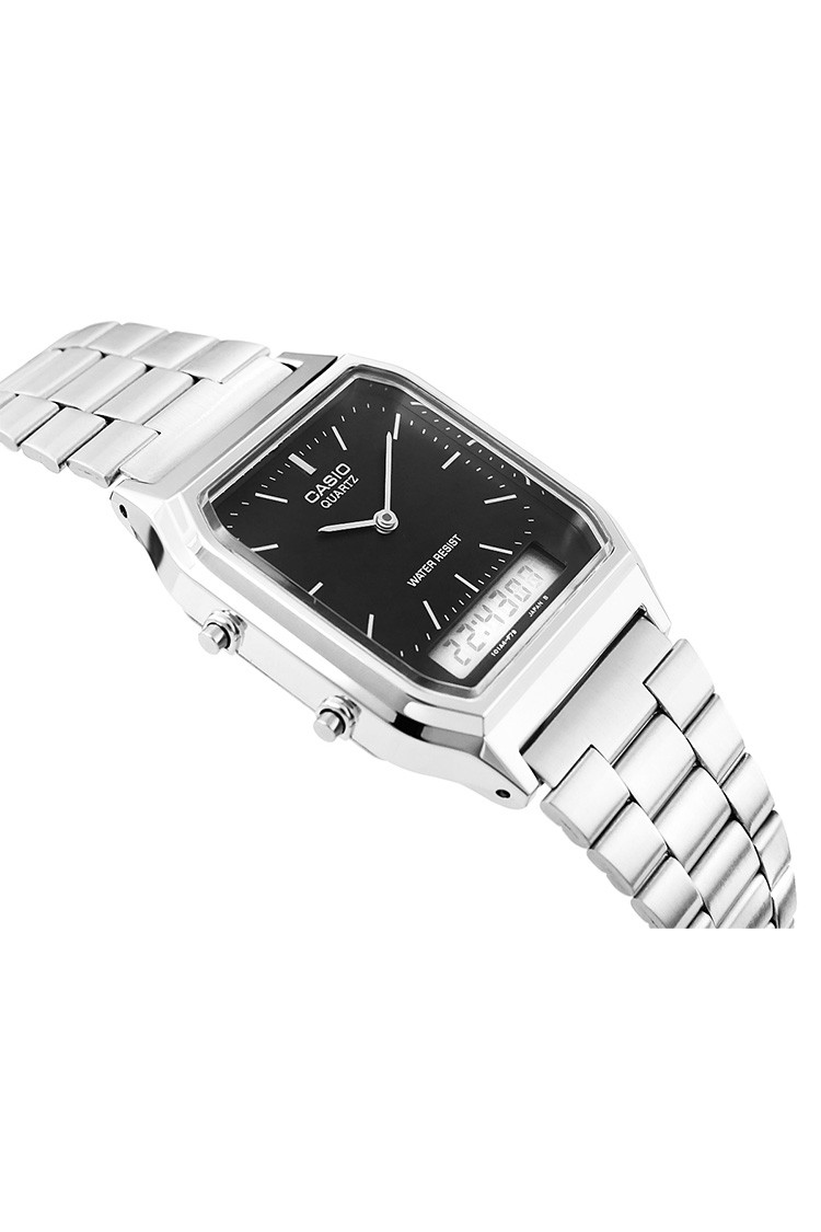 - CASIO AQ-230A-1DMQ е елегантен унисекс часовник, който комбинира аналогово показване на часа с дигитален дисплей за допълнителни функции.