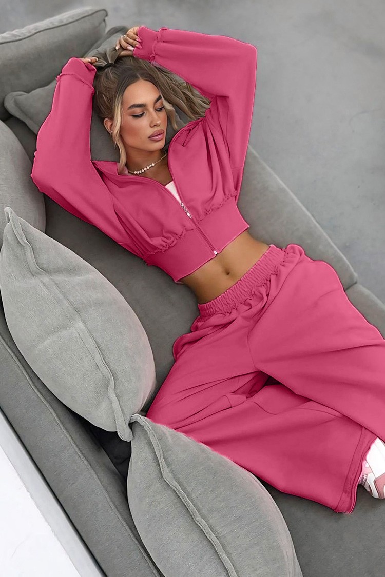 • Комплектът е със свободна кройка. Горната част е с цип и качулка, а панталонът е с тренди широки крачоли и ластична талия.