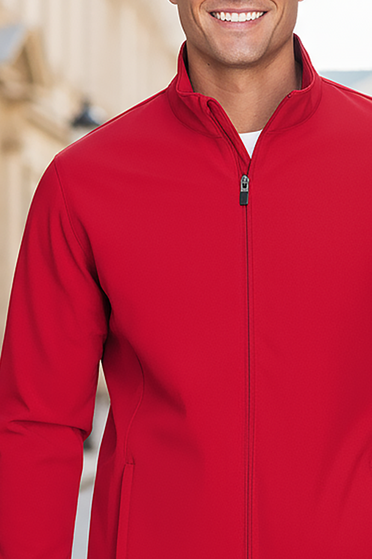 - Мъжко яке с едноцветен десен и удобни джобове със скрит цип, разположени странично от двете страни, подходящо за ежедневието или туризъм.