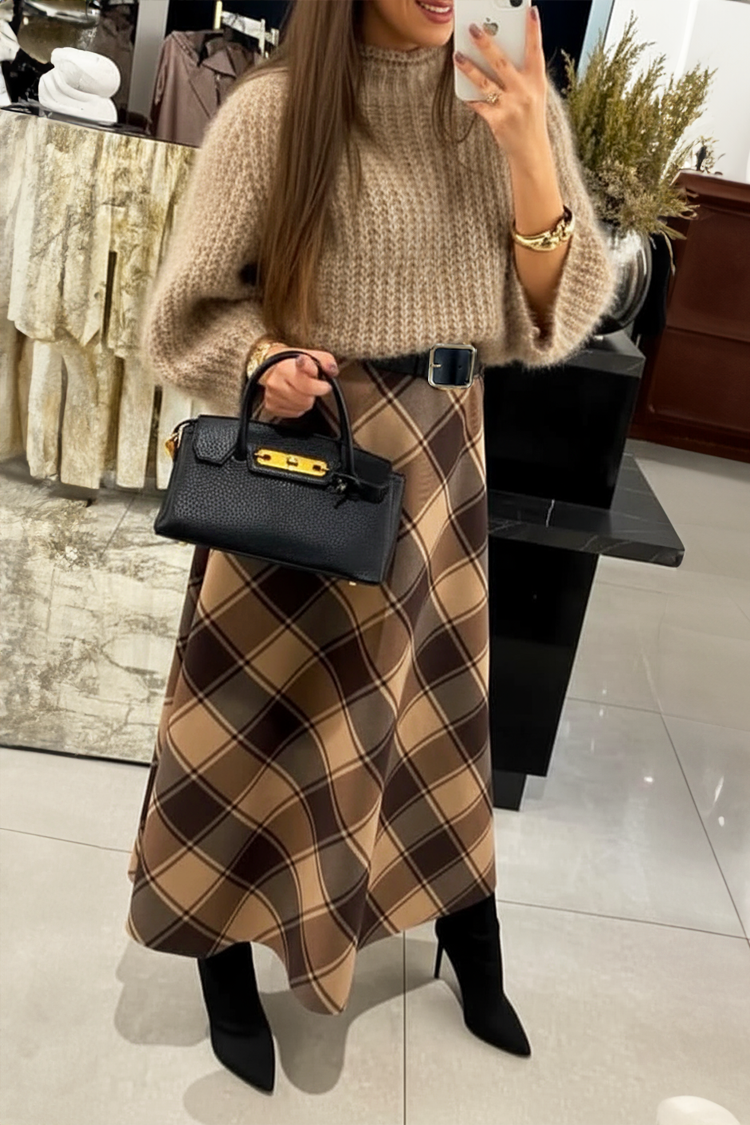 - Моделът е с висока талия, ефектен десен на каре и удобна кройка, подходяща за всяка фигура.