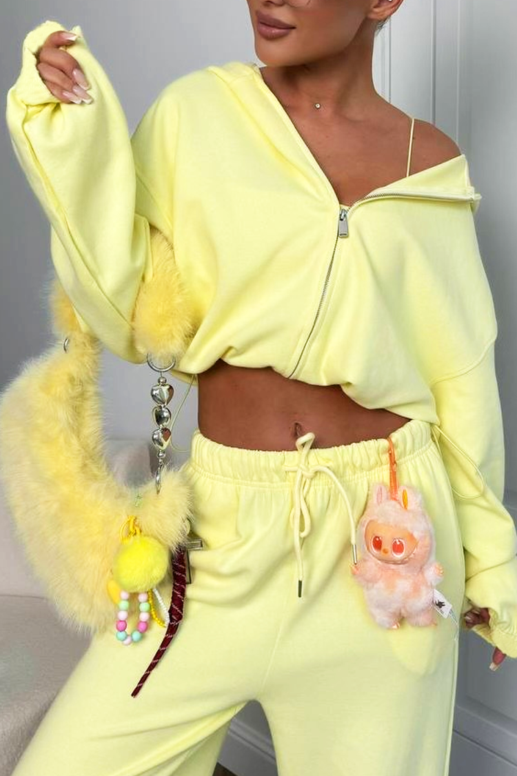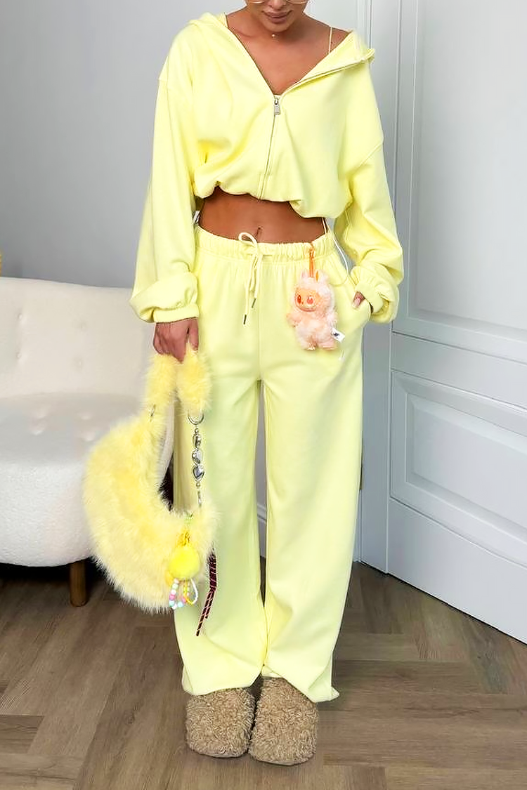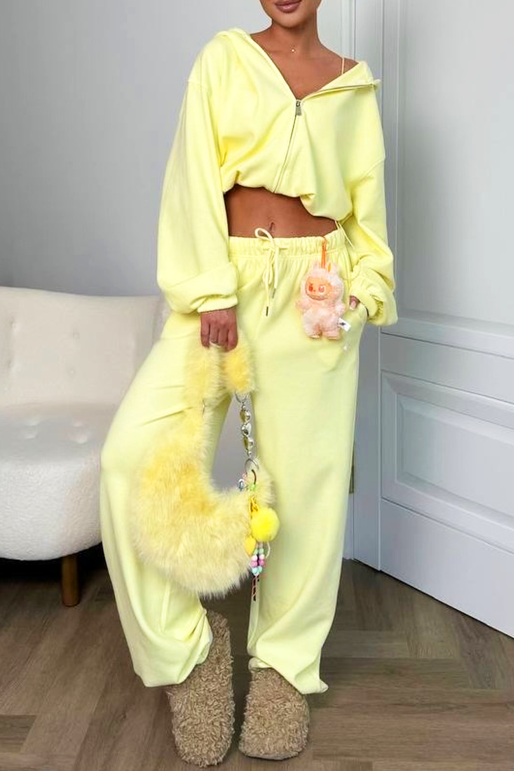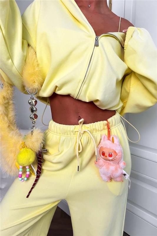 - Къс кроп суичър с качулка, комбиниран с панталон с висока ластична талия и разкроена линия за модерна визия.