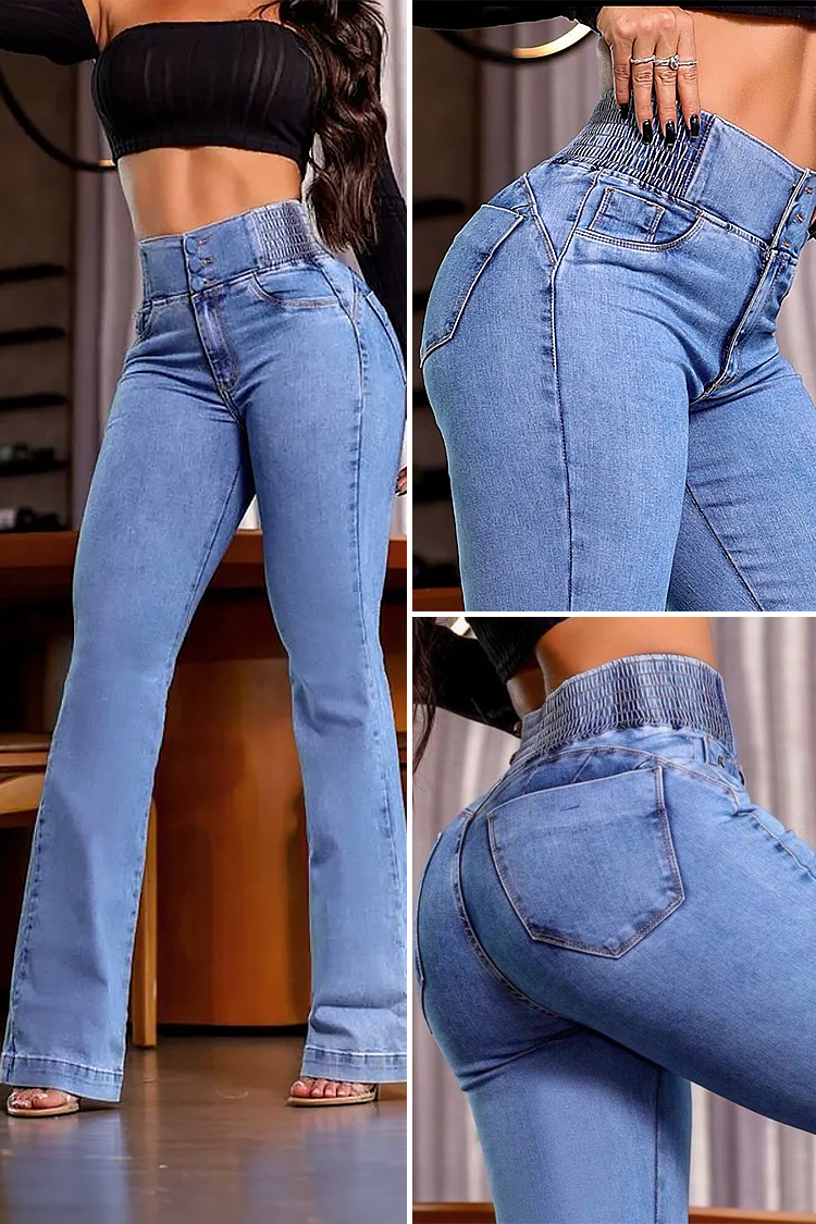 - С висока талия и вталена кройка, която красиво подчертава извивките и оптически издължава силуета.