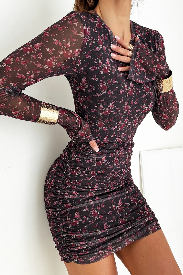 • Роклята е с вталена кройка, дълги ръкави и флорални мотиви.