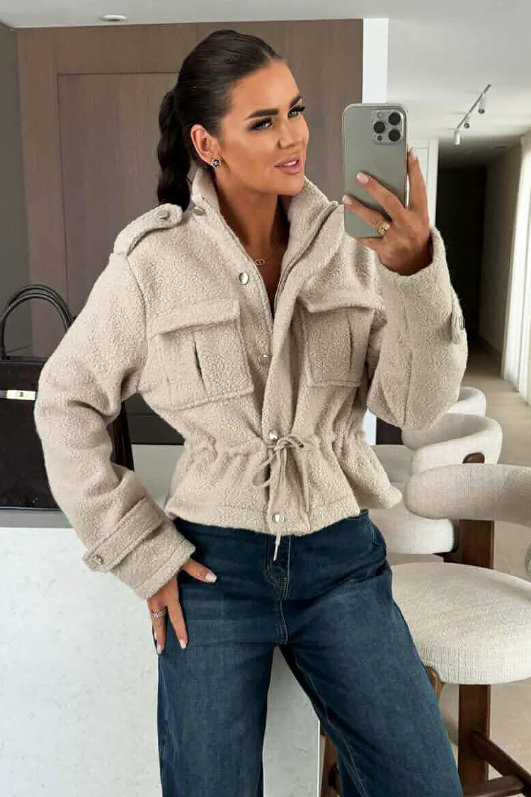 • Якето е с удобна кройка, връзки на талията и закопчаване с цип.