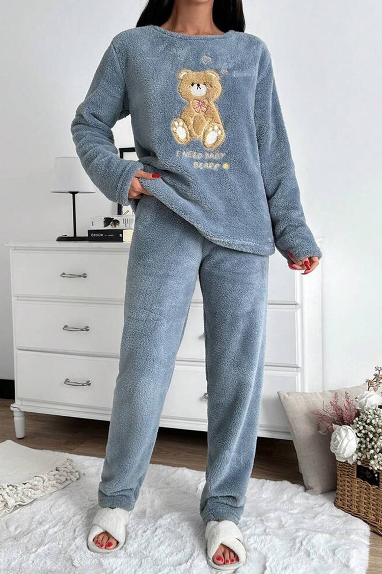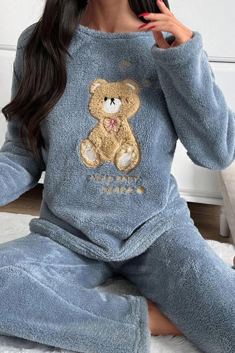 - Блузата е с ефектен дизайн с мече, а панталонът е с висока талия и свободна кройка.