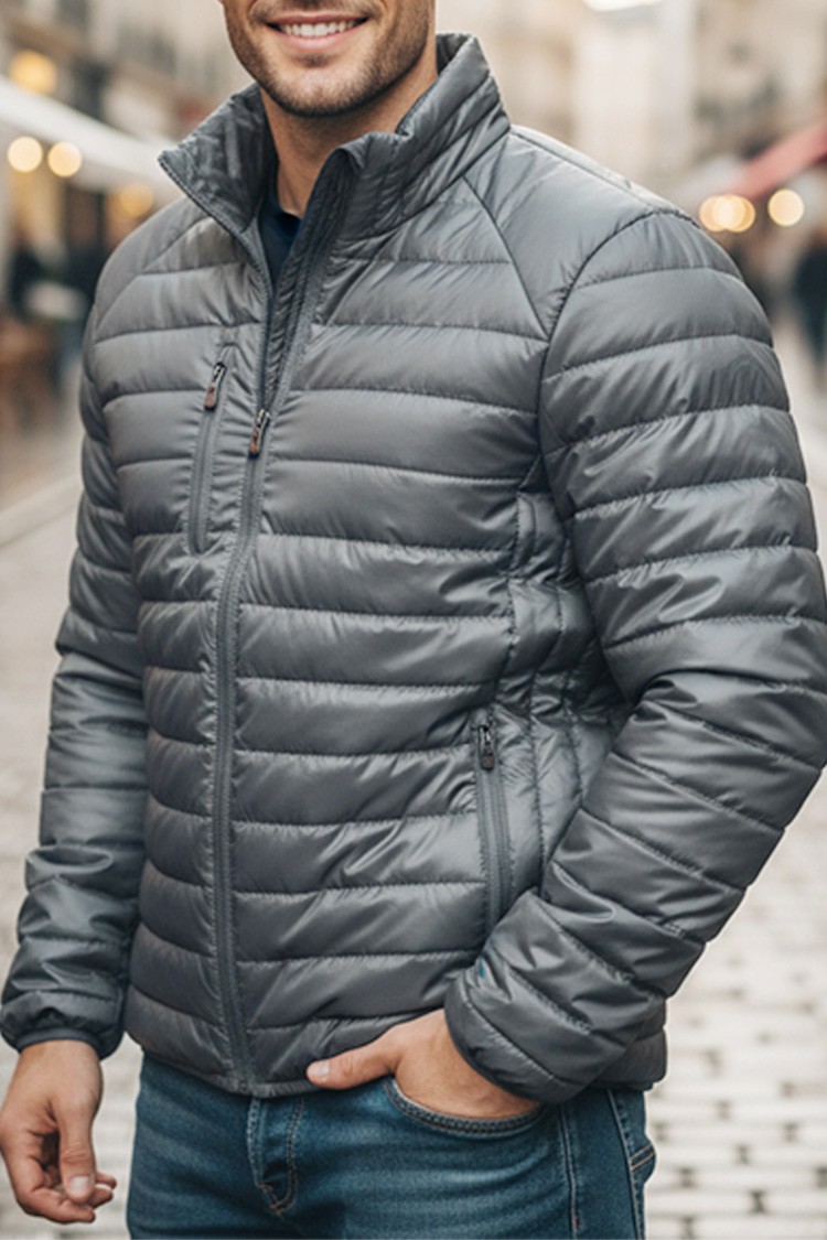 - Удобно мъжко яке в цвят графит, централно закопчаване с цип и джобове.