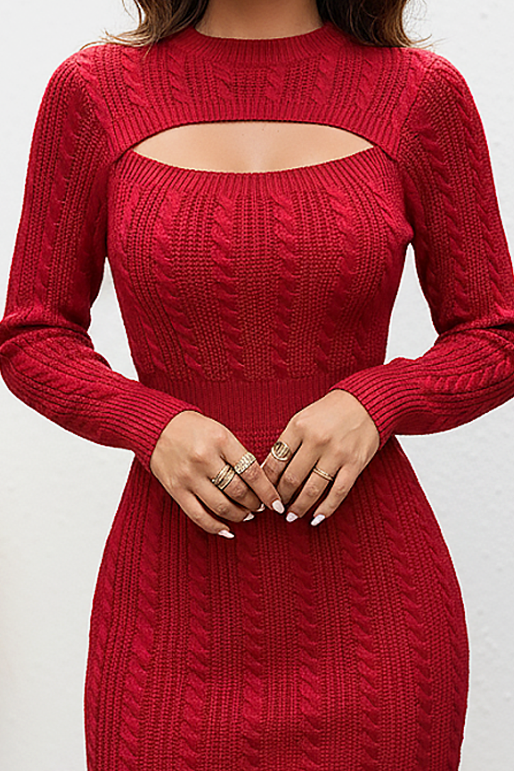 - Роклята е с вталена кройка, дълги ръкави и секси деколте.