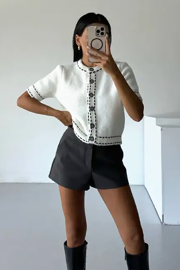 - Мека и топла дамска жилетка с къси ръкави, подходяща за ежедневни тренди визии.