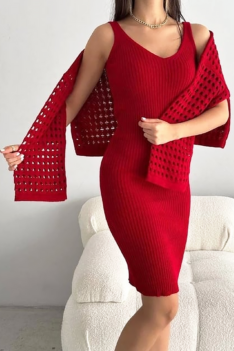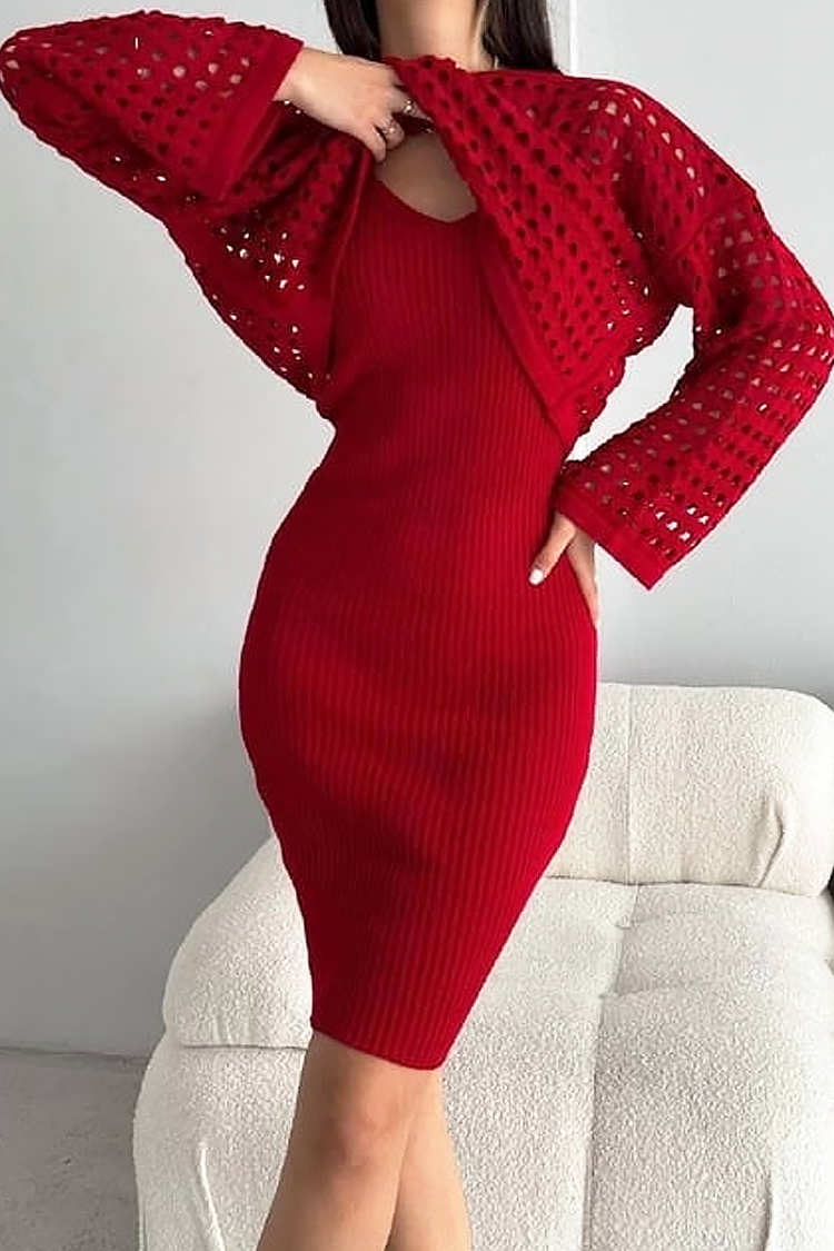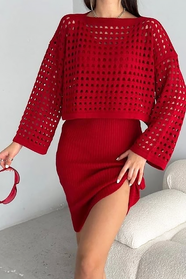 - Дамски комплект от две части, състоящ се от къса рокля и ефектен пуловер, подходящ за тренди визии.