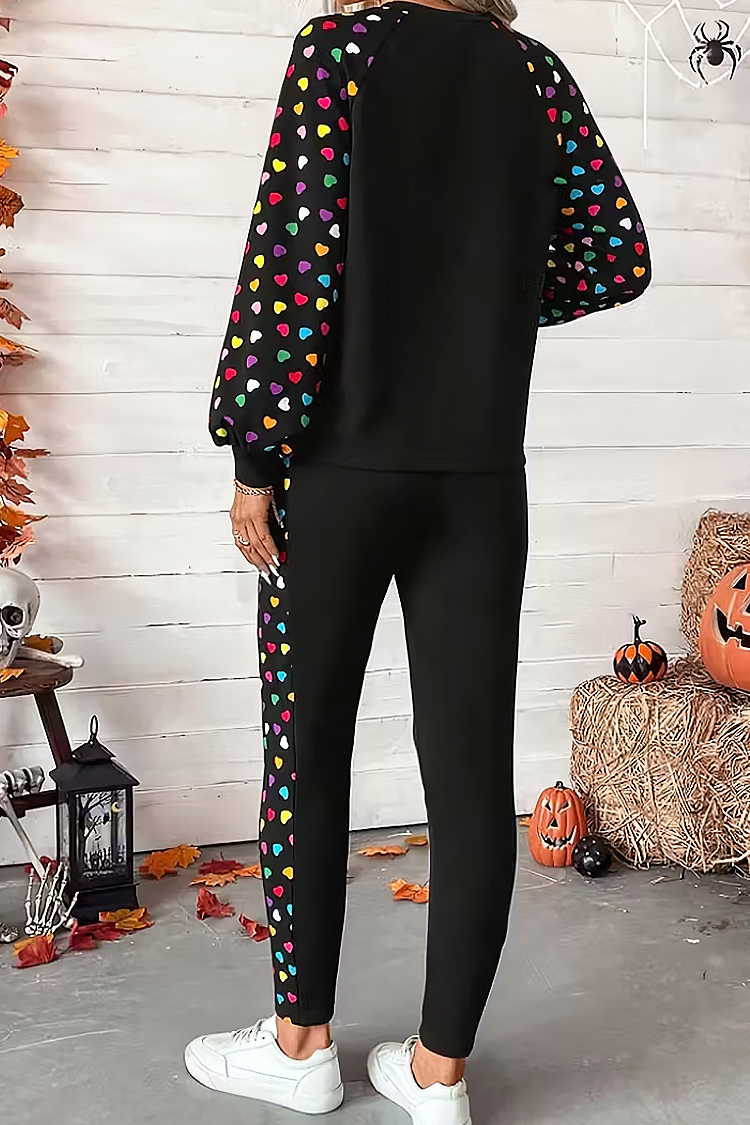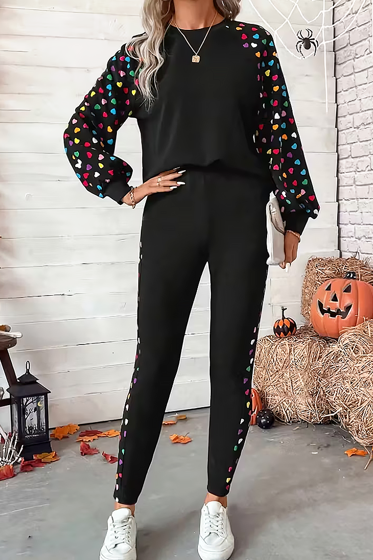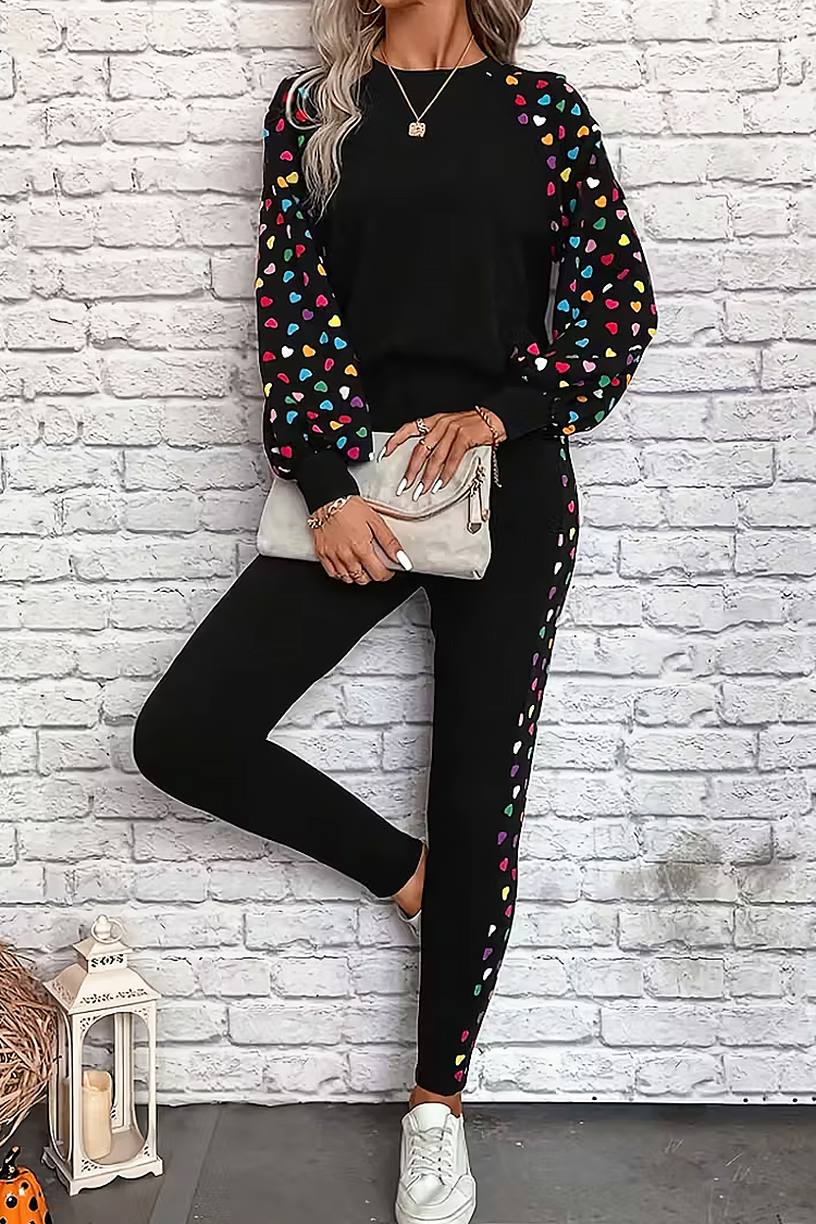 - Блузата е с удобна кройка и ефектен десен на ръкавите, а панталонът е с висока талия и вталени крачоли.