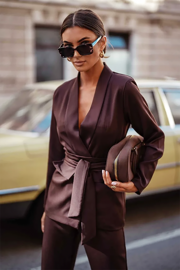 - Панталонът е с висока талия и широки крачоли, а сакото - с елегантен дизайн, яка и колан.