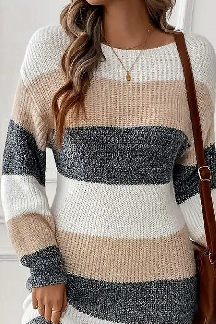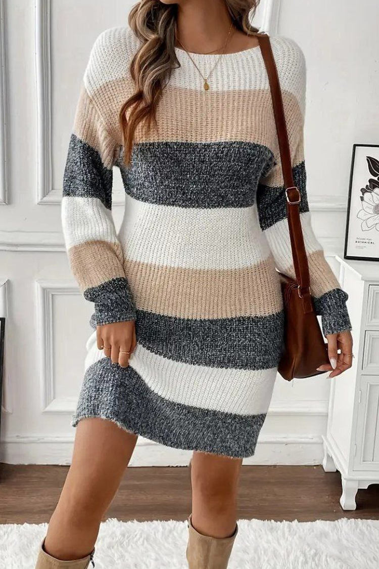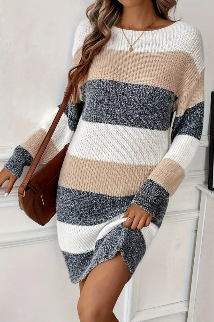 - Роклята е с къса дължина, удобна кройка и ефектен десен на райе.