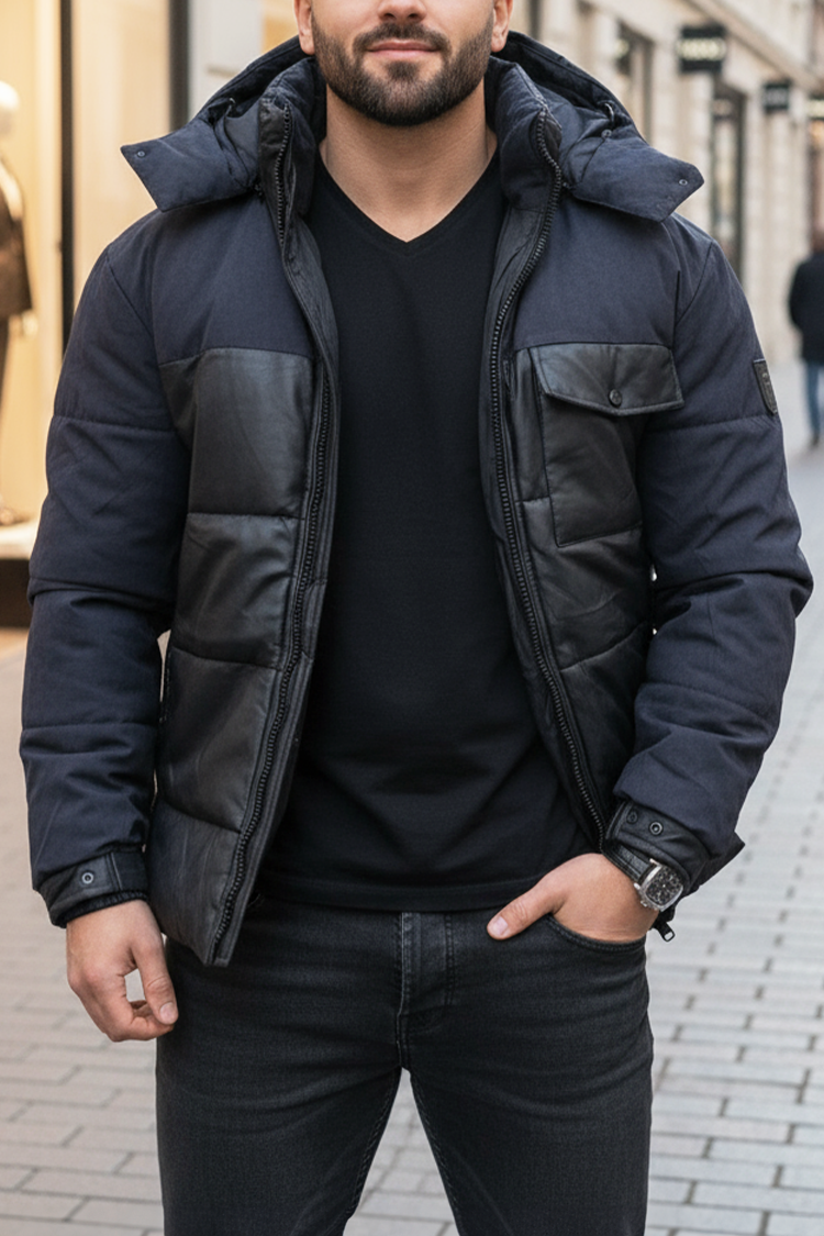 - Елегантно и модерно мъжко зимно яке в черен цвят, съчетаващо стил и функционалност.