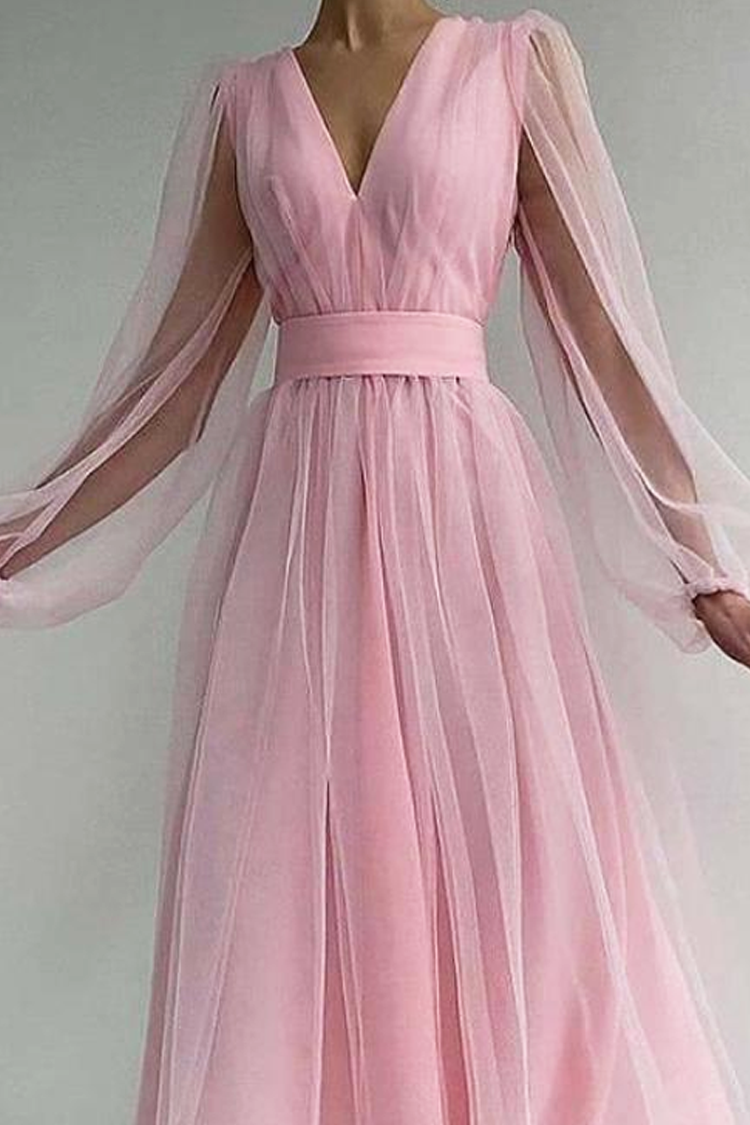 - Роклята е с разкроена кройка, V- образно деколте, дълги ръкави и ефектен тюл.