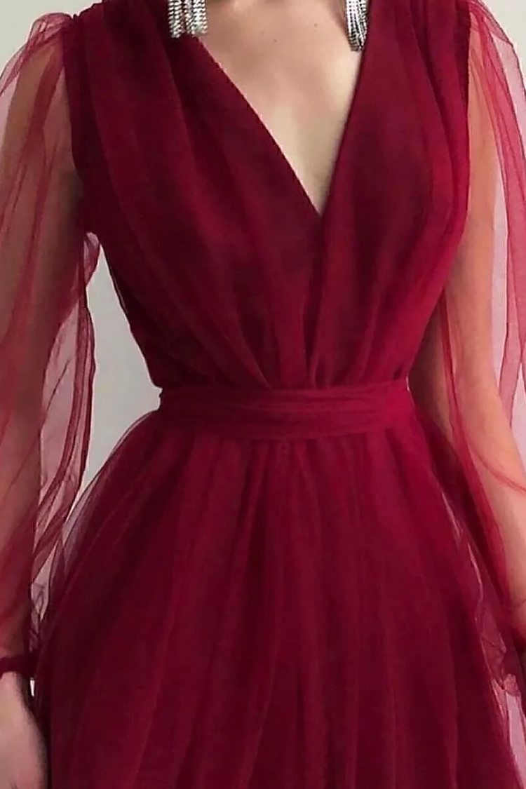 - Роклята е с разкроена кройка, V- образно деколте, дълги ръкави и ефектен тюл.