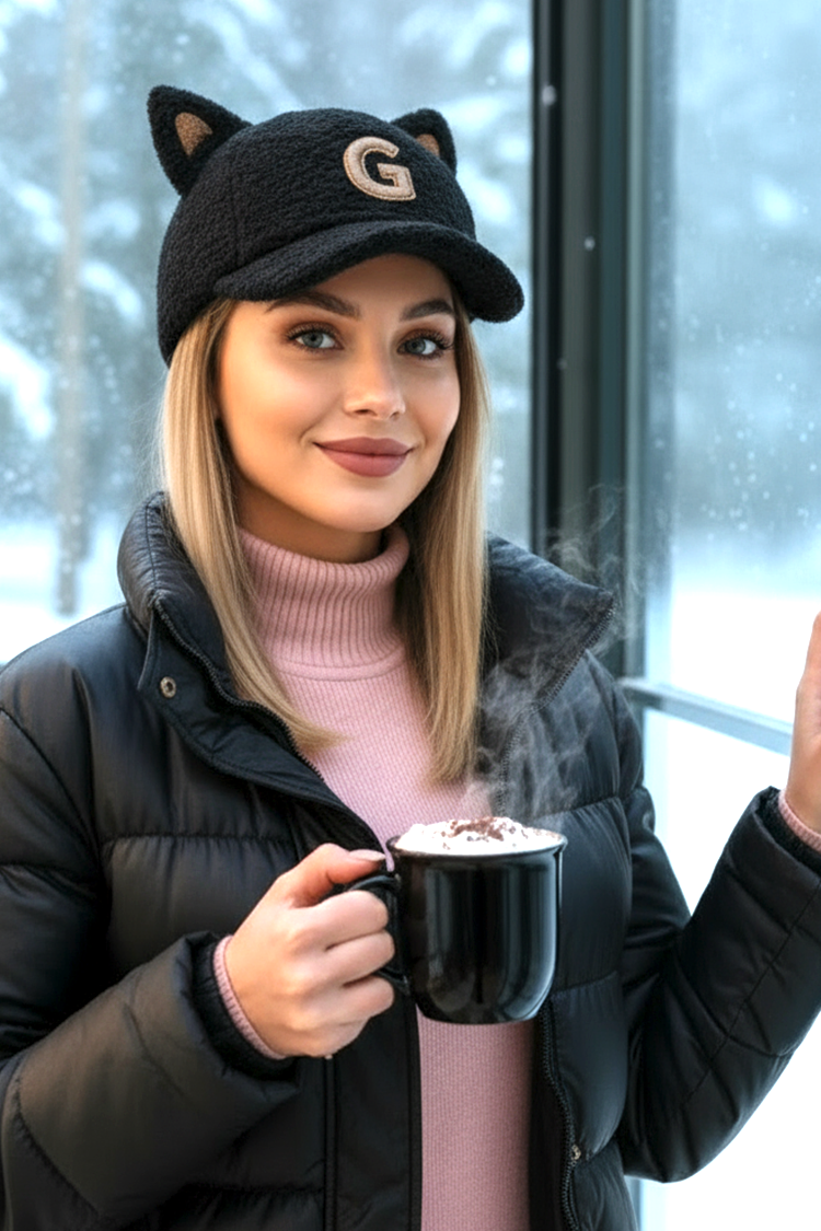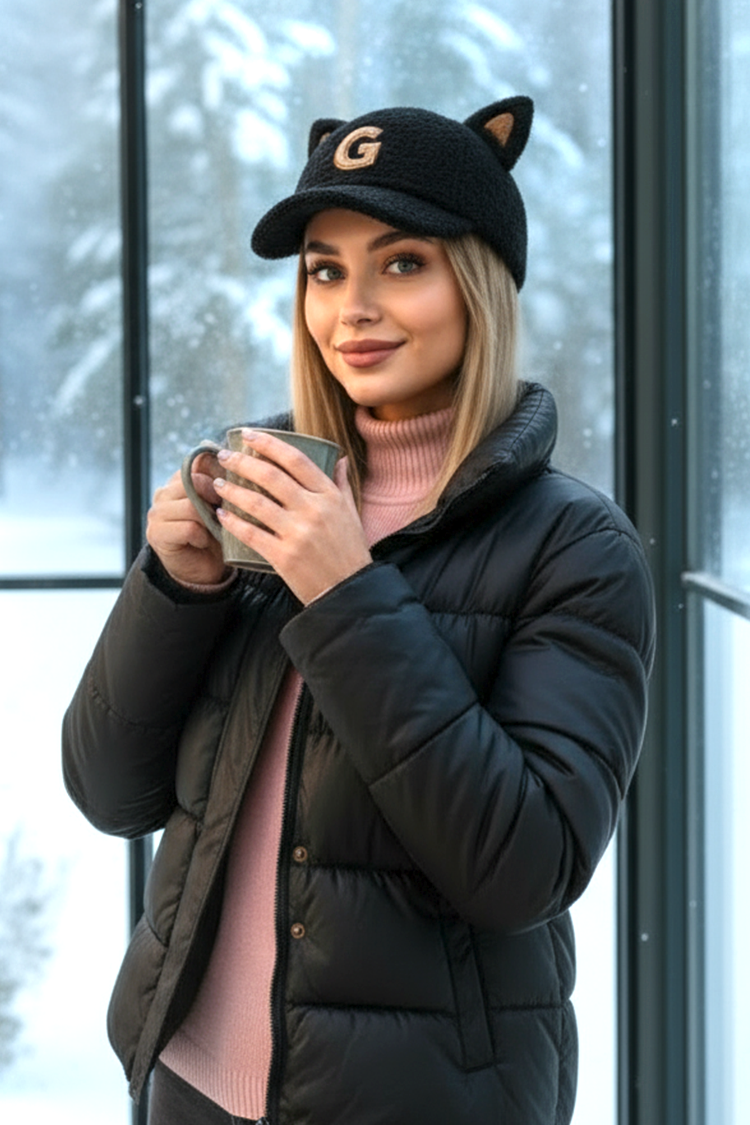 - За стилна визия в студените дни, изберете тази пухкава шапка с козирка и ушички.