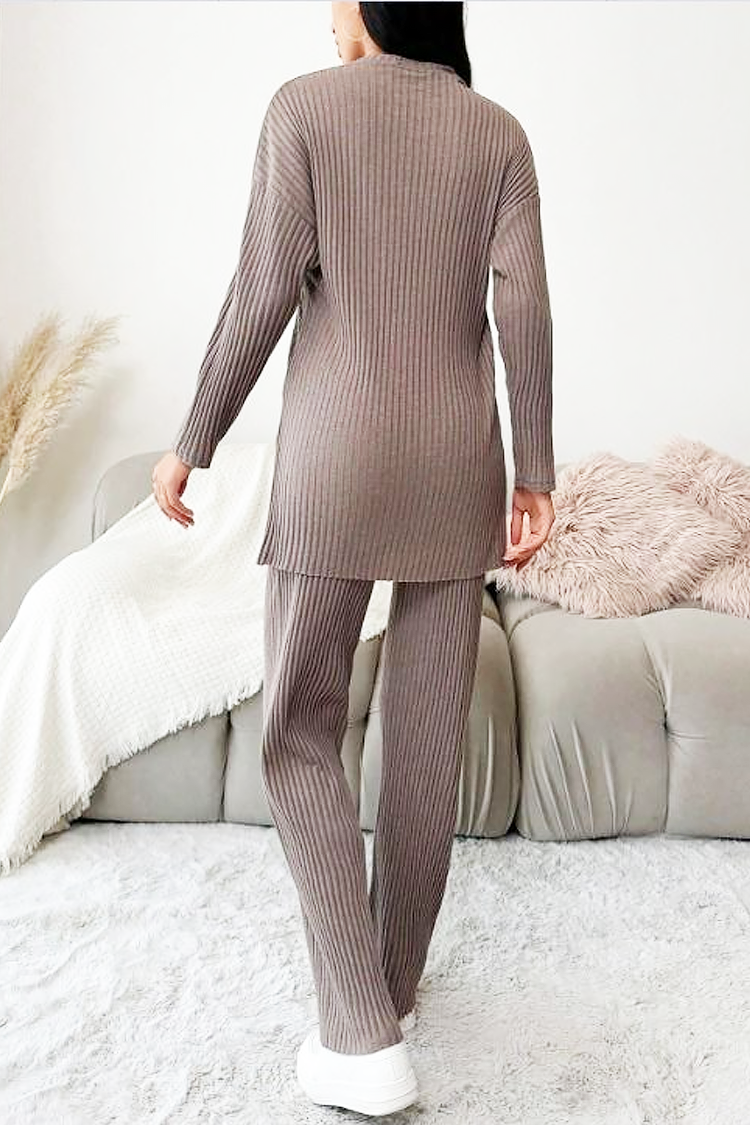 - Блузата е с удобна кройка и дълга дължина, а панталонът е с висока талия и широки крачоли.