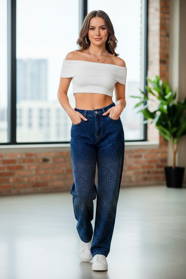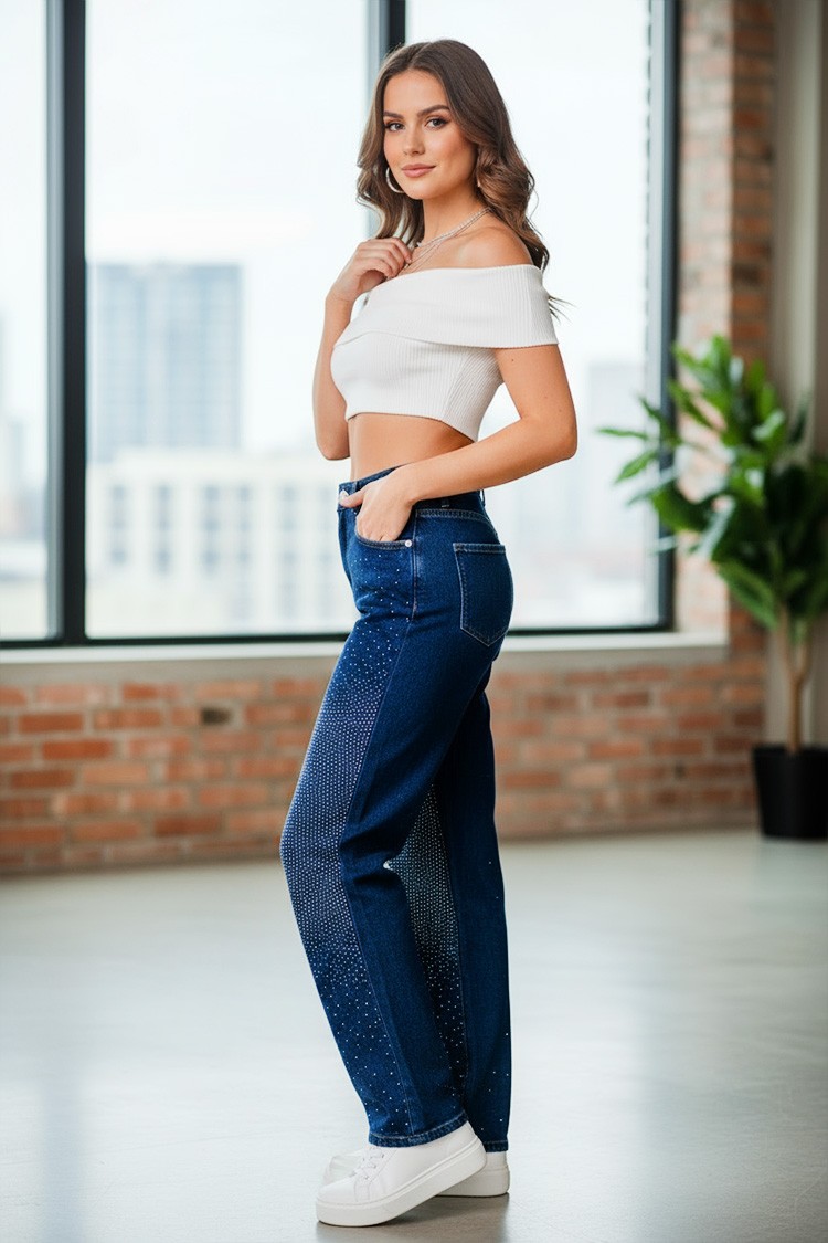 - Моделът е с висока талия и невероятен дизайн с блестящи камъчета.