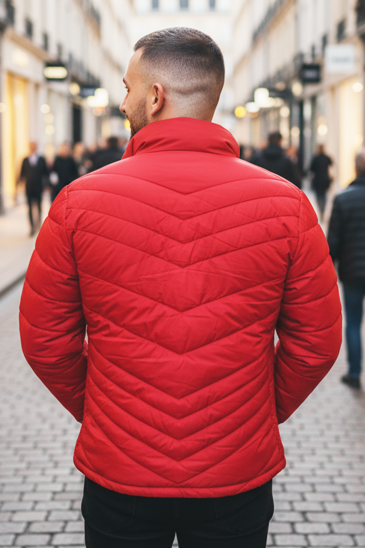 - Удобно мъжко яке в червен цвят, централно закопчаване с цип и джобове.