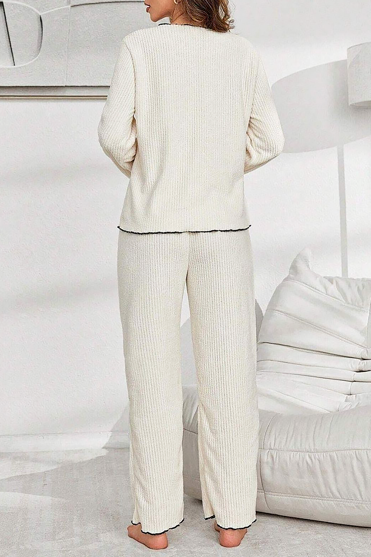 • Горната част се закопчава с копчета по дължината, а панталонът е с висока талия и свободна кройка.