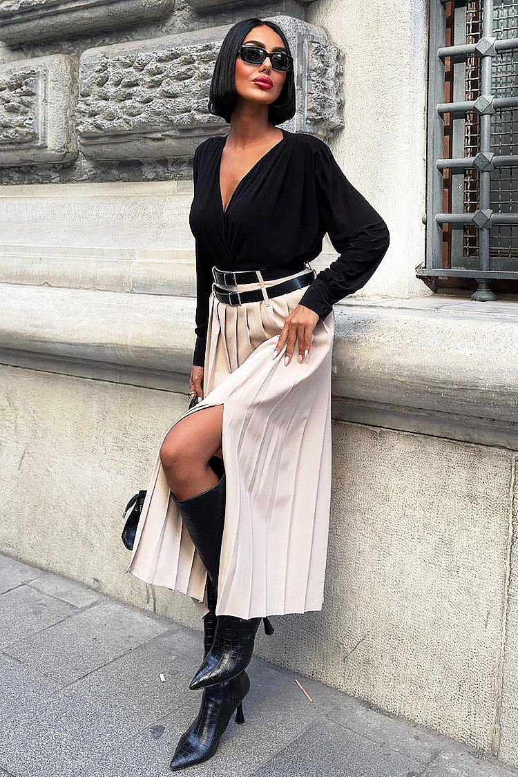 - Моделът е с миди дължина, висока талия и секси цепка.