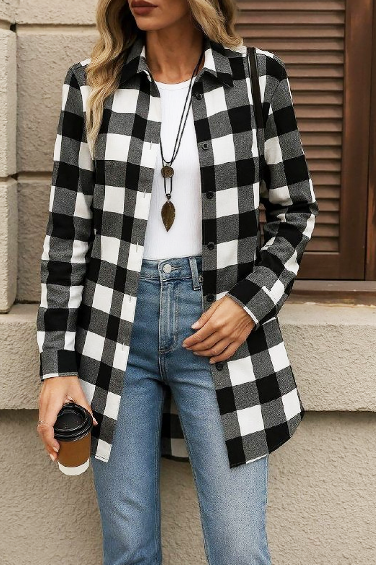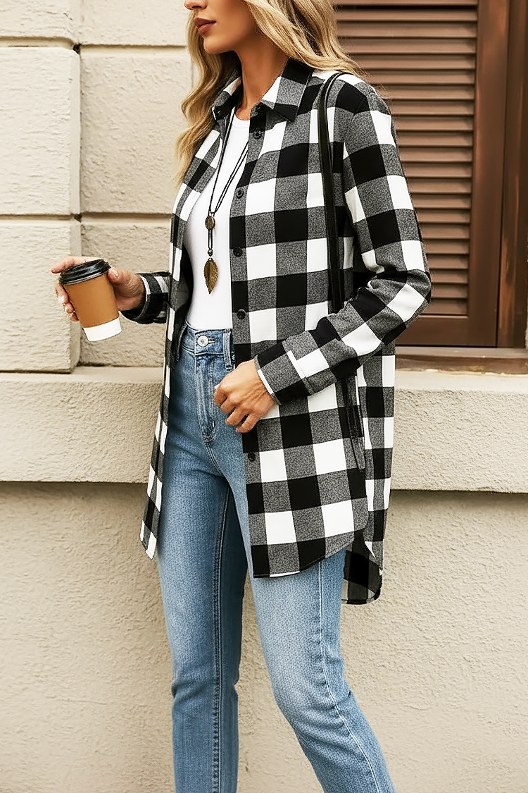 - Моделът е с асиметрична кройка, кариран дизайн и стандартно закопчаване с копчета.