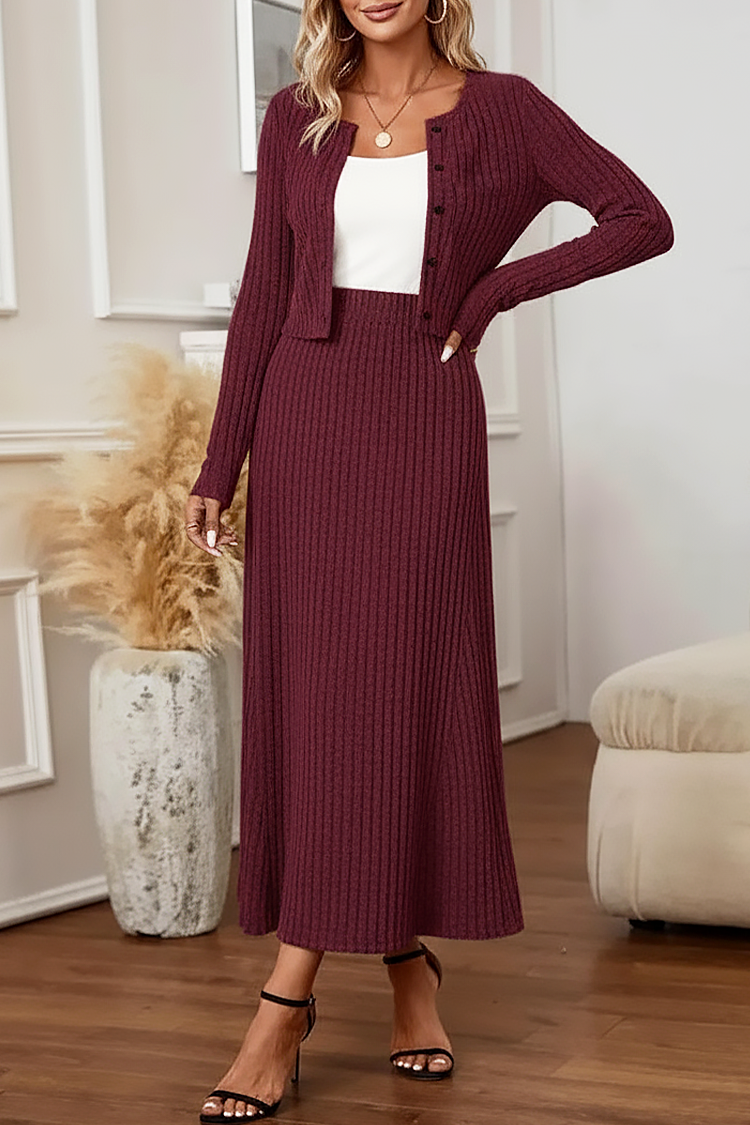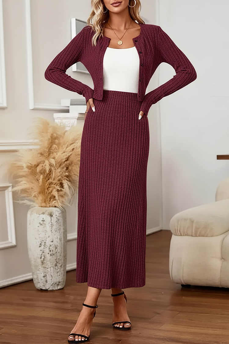 - Актуален комплект от две части - комфортна пола и жилетка със семпъл дизайн.