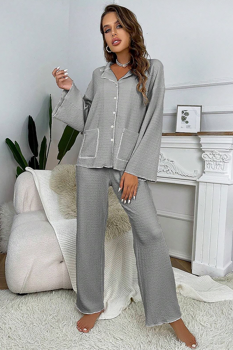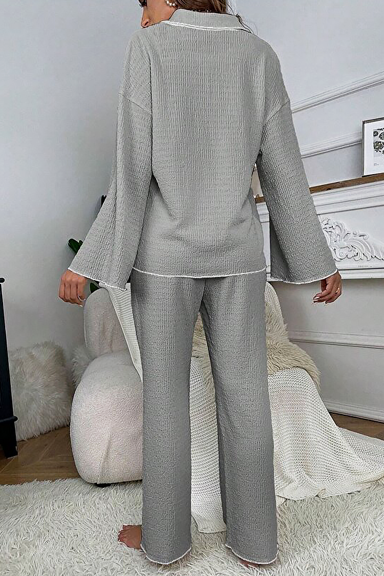 - Горната част е с копчета и яка, а панталонът е с висока талия и свободна кройка.