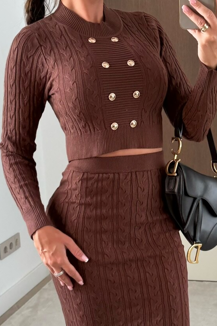 - Полата е с вталена кройка и миди дължина, а жилетката има двуредно закопчаване с копчета.