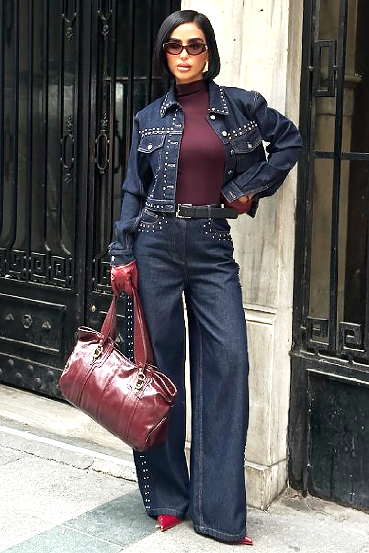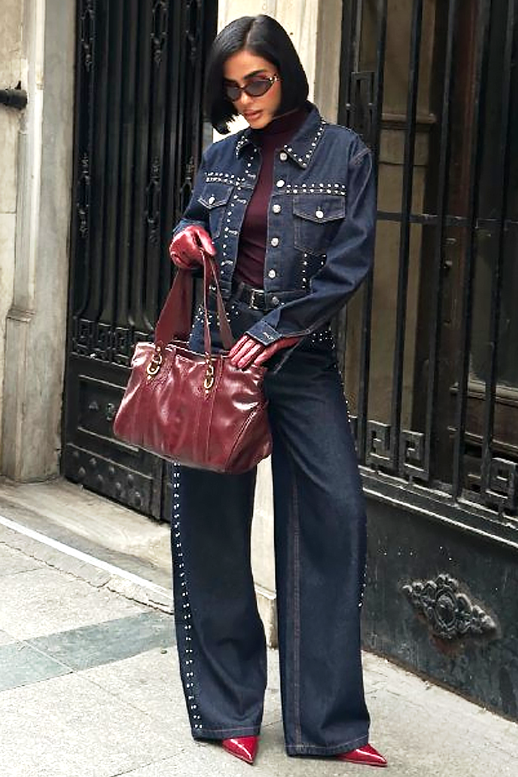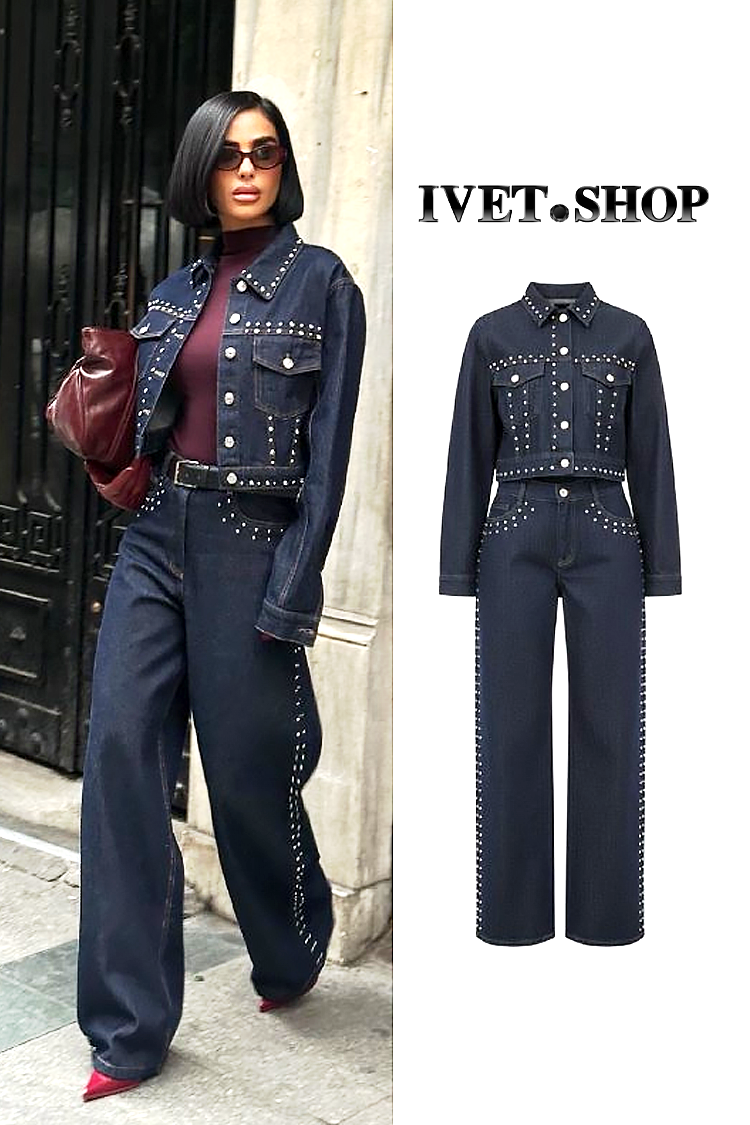 • Якето е със стандартно закопчаване с копчета отпред, а дънките са с висока талия и комфортни крачоли.