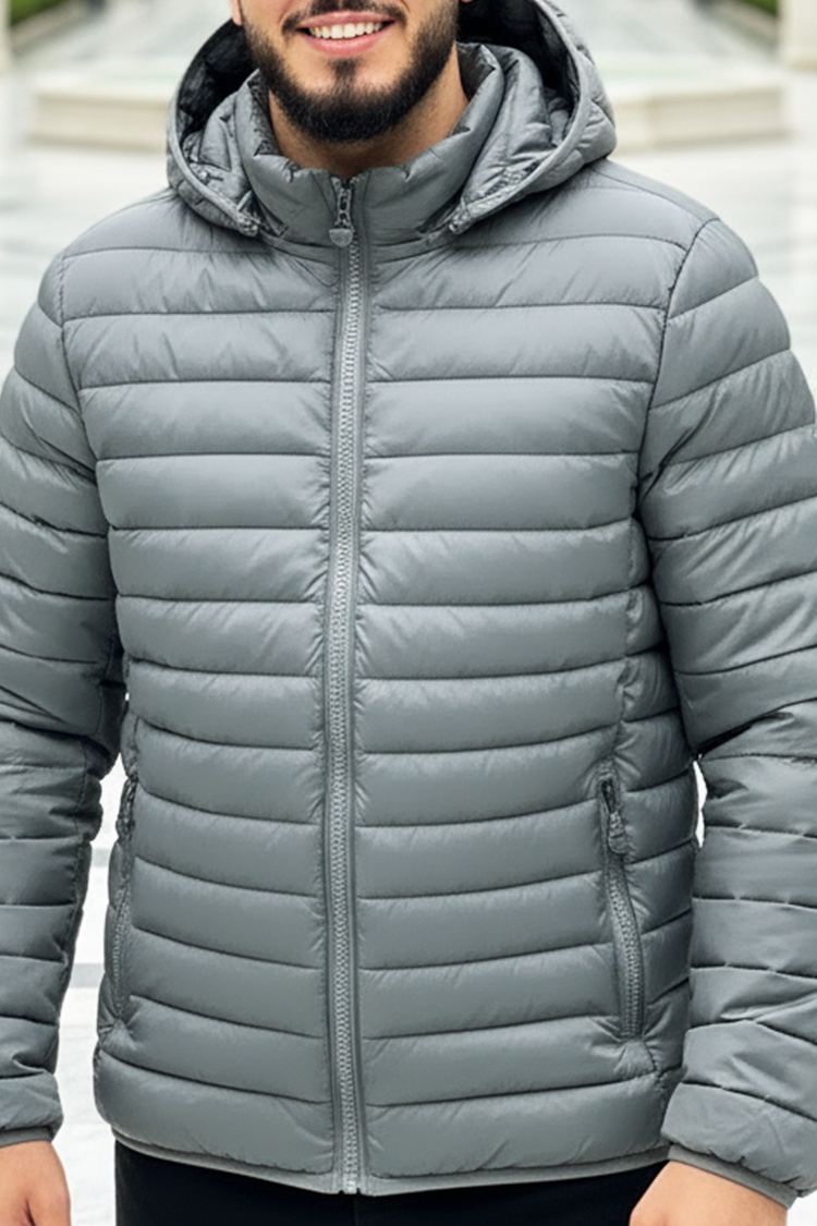 - Удобно мъжко яке с хоризонтален капитониран дизайн и сваляща се качулка в тъмносин цвят със спортно-ежедневен стил.
