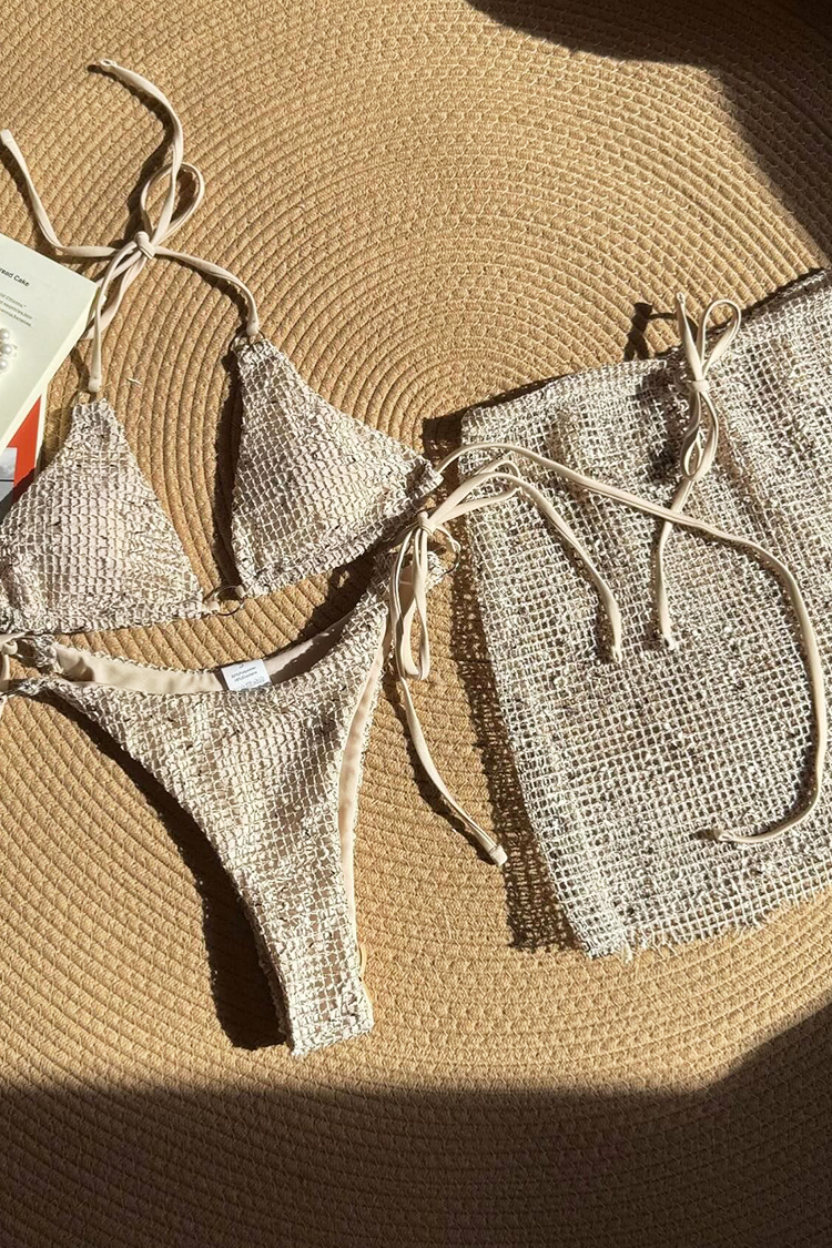 - Комплектът е от три части и е с атрактивен дизайн, който ще подчертае вашия неповторим стил и тен! Горнището има подвижни подплънки, които оформят деколтето.