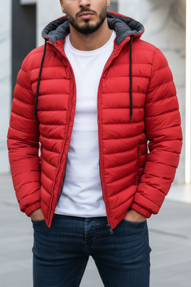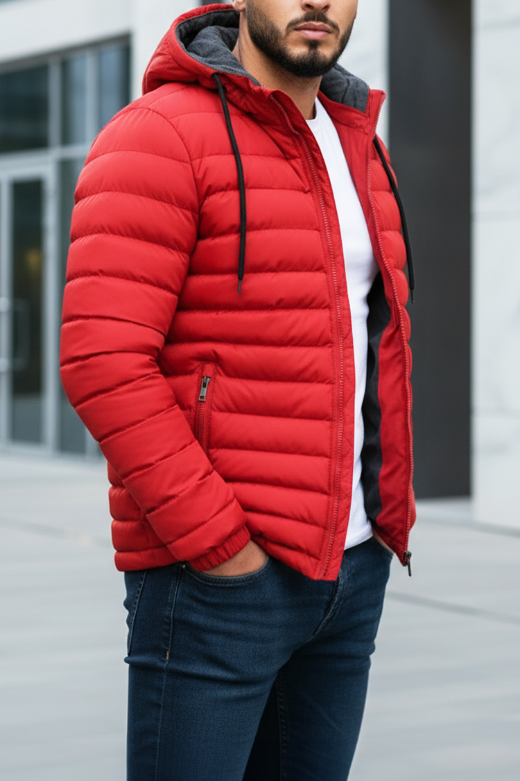 - Представяме ви нашето специално предложение: мъжко зимно яке в тренди дизайн в червен цвят.