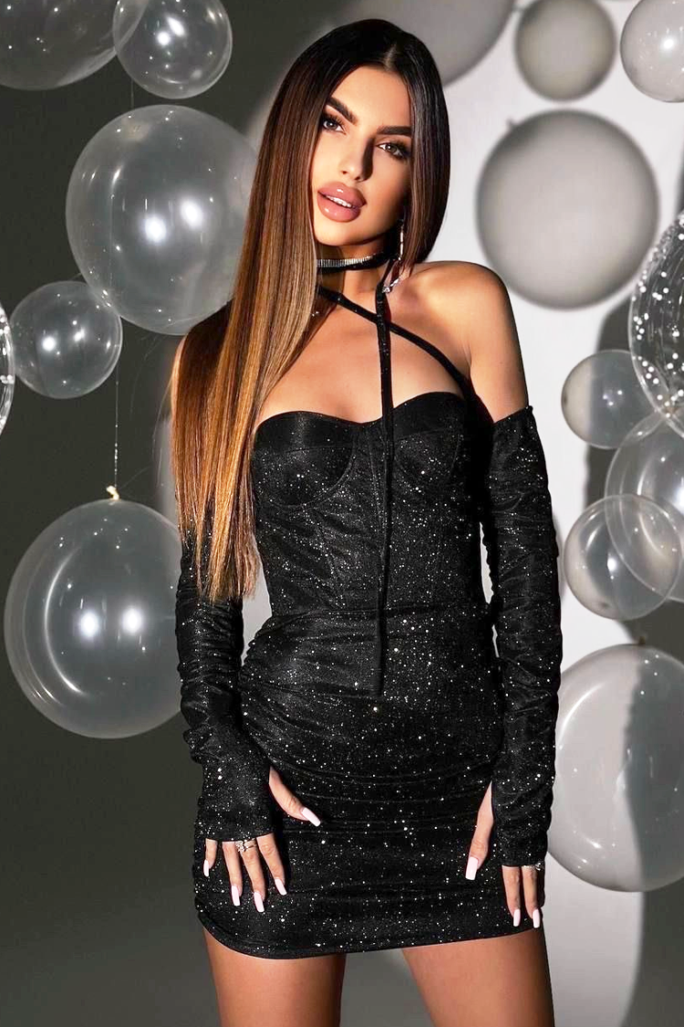 - За перфектната парти визия се доверете на тази къса рокля с атрактивен, блестящ дизайн.