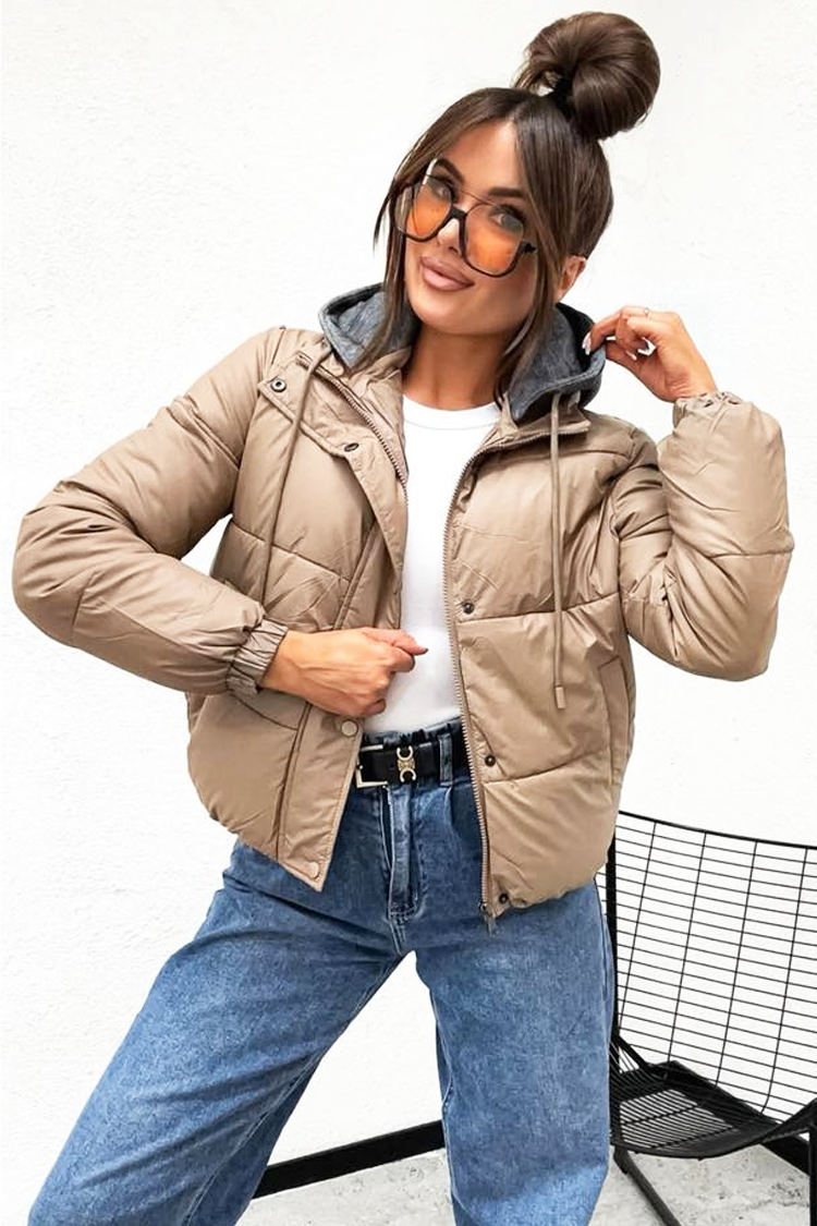 - Моделът е с удобна кройка, качулка с връзки и двойно закопчаване с копчета и цип.