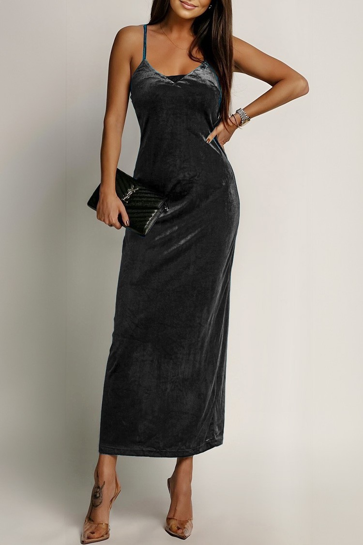 - Роклята е с вталена кройка, тънки презрамки и дълга дължина. Моделът се закопчава със скрит цип на гърба.