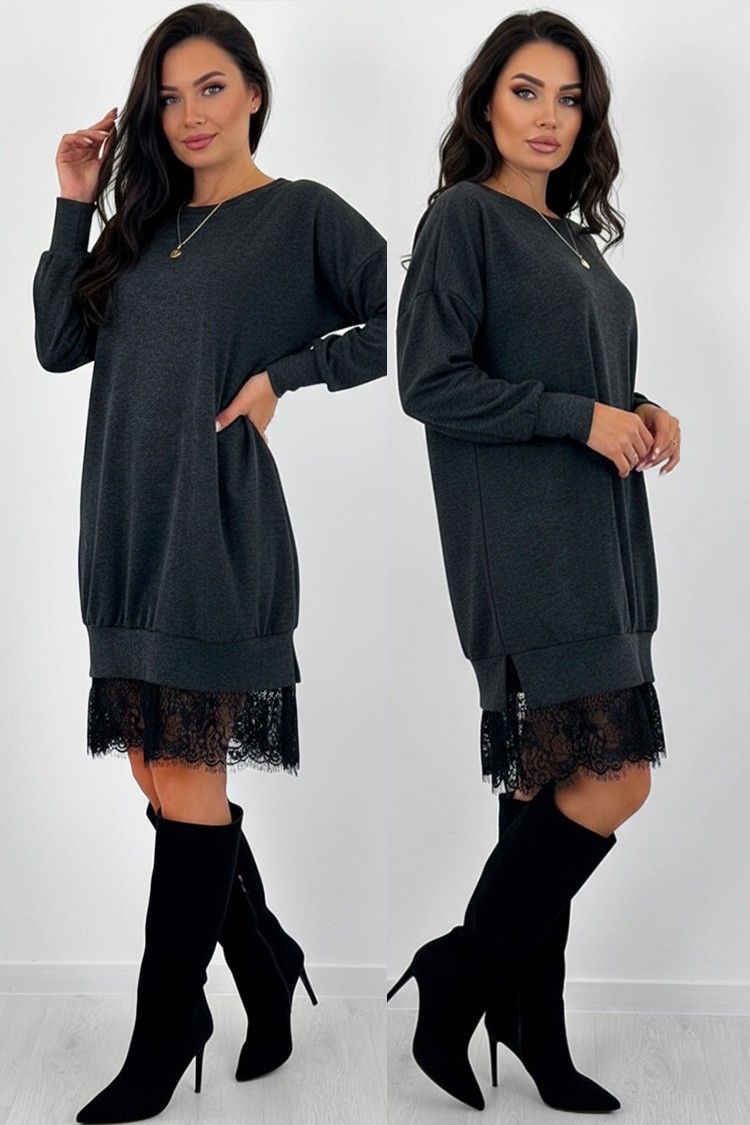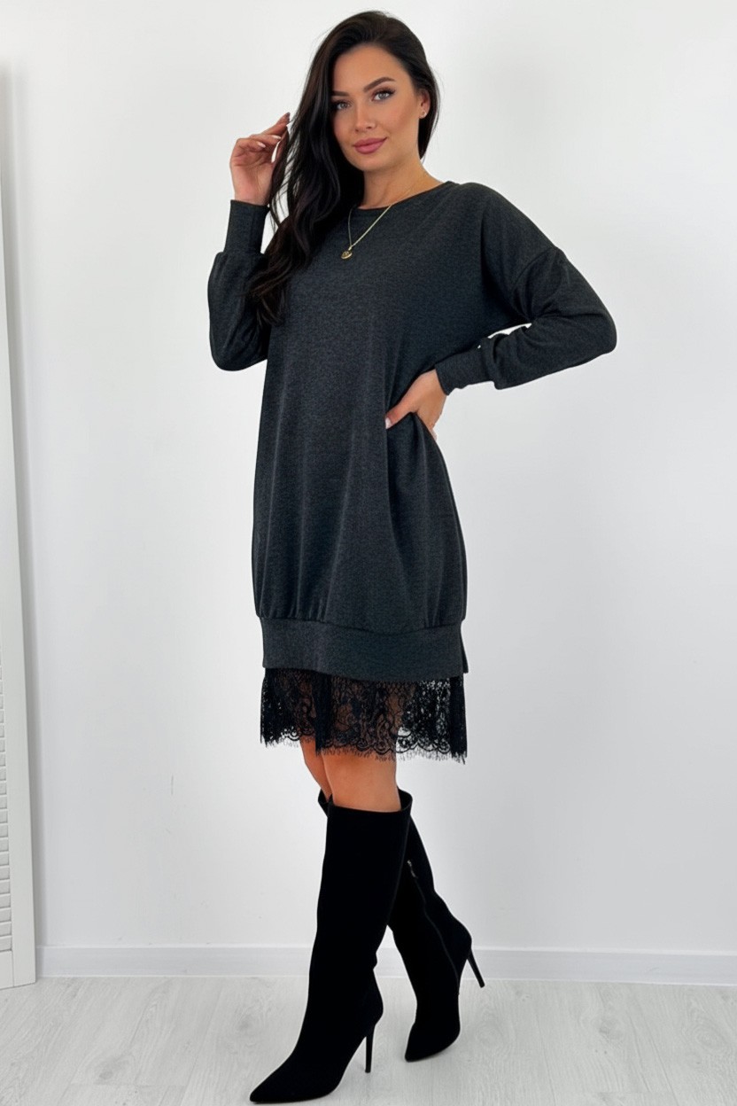 - Моделът е със свободна кройка, подходяща за всяка фигура, и ефектна дантела в долната част.