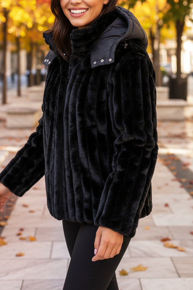 - Моделът е с удобна кройка, закопчаване с цип, обемна качулка и пух по цялата дължина.