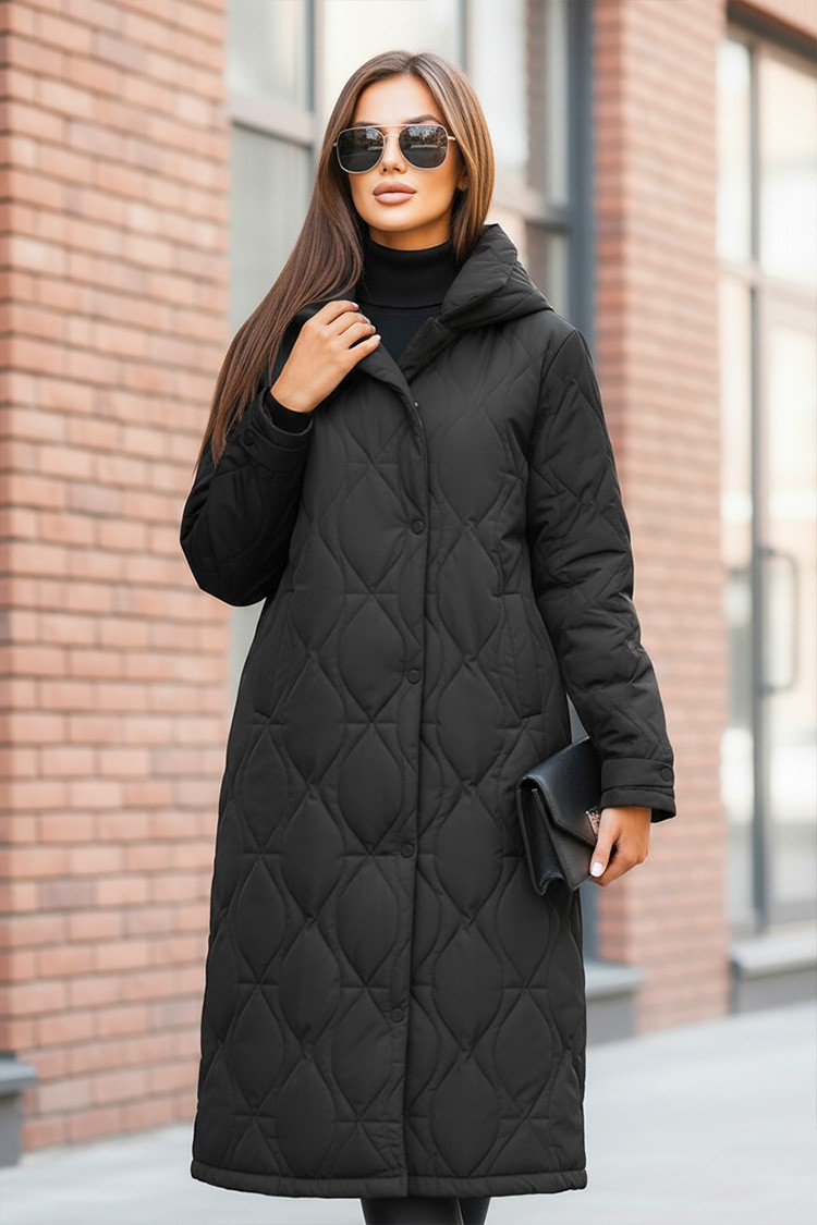 - Моделът е с удобна кройка, закопчаване с копчета, миди дължина, стилна яка и джобове.