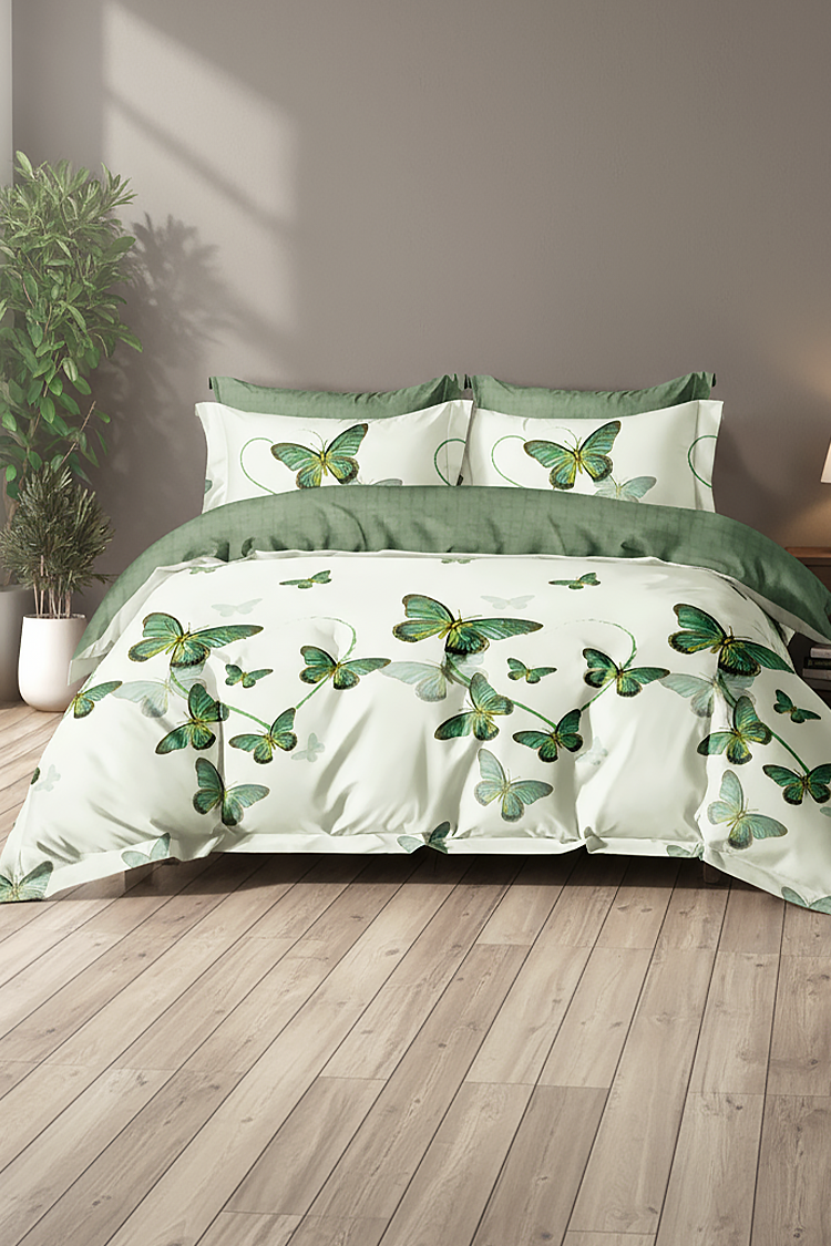 - Спален комплект от четири части с размери 200x220 см., изработен от висококачествен памучен сатен.